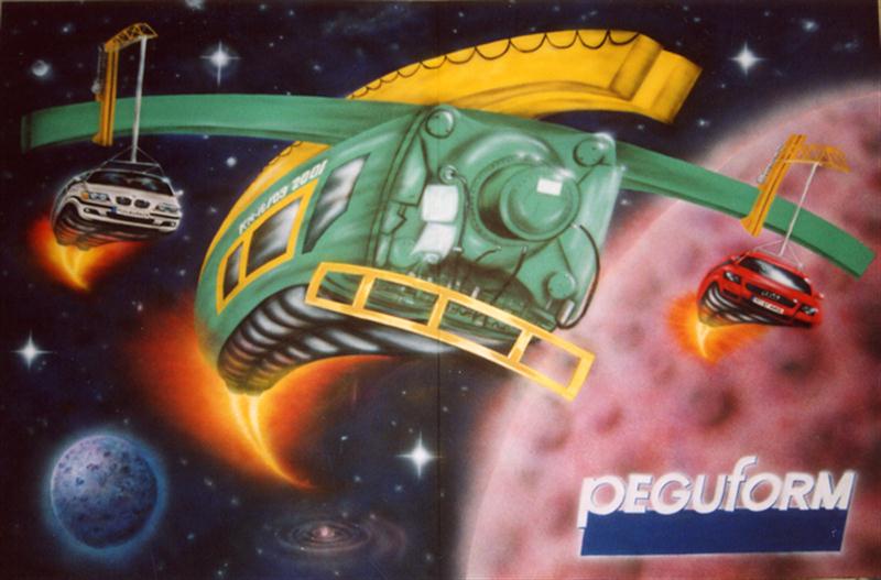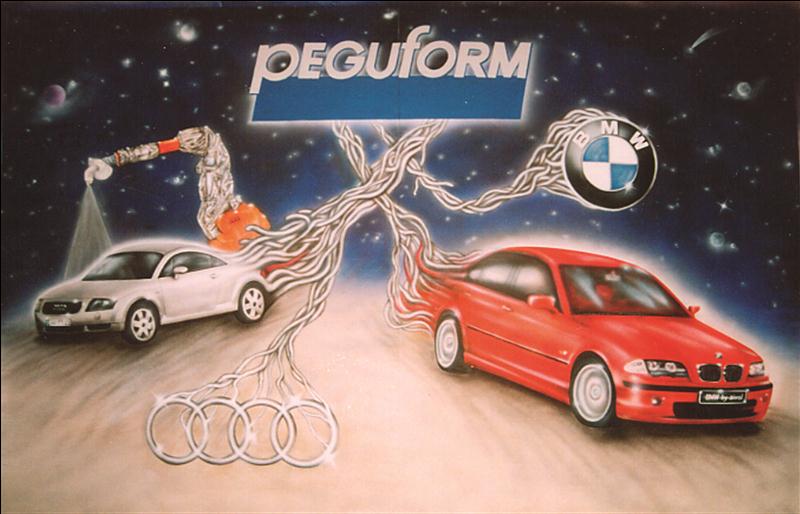 „Peguformation“ ist der Titel dieses Gemäldes auf Leinwand. Das 600 x 200 cm große Werk wurde zum 20-jährigen Firmenjubiläum der Firma Peguform GmbH in Auftrag gegeben und von Anton Simon, Werksleiter während des Festaktes am Tag der offenen Tür enthüllt.