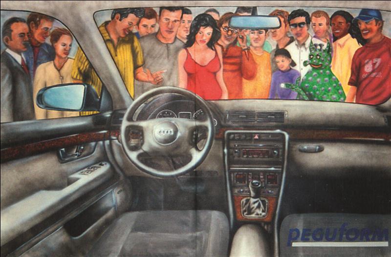 Dieser Kunde ist ein Zulieferbetrieb in der Automobilindustrie, produziert Kunststoffteile für die großen deutschen Fahrzeughersteller wie z. B. Audi, BMW oder Porsche. In den vergangenen Jahren haben wir bereits einige großformatige Auftragsarbeiten ausgeführt, wobei für die Motive bestimmte Fahrzeugtypen und Logos der beteiligten Firmen berücksichtigt wurden.