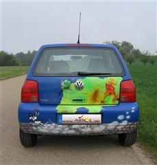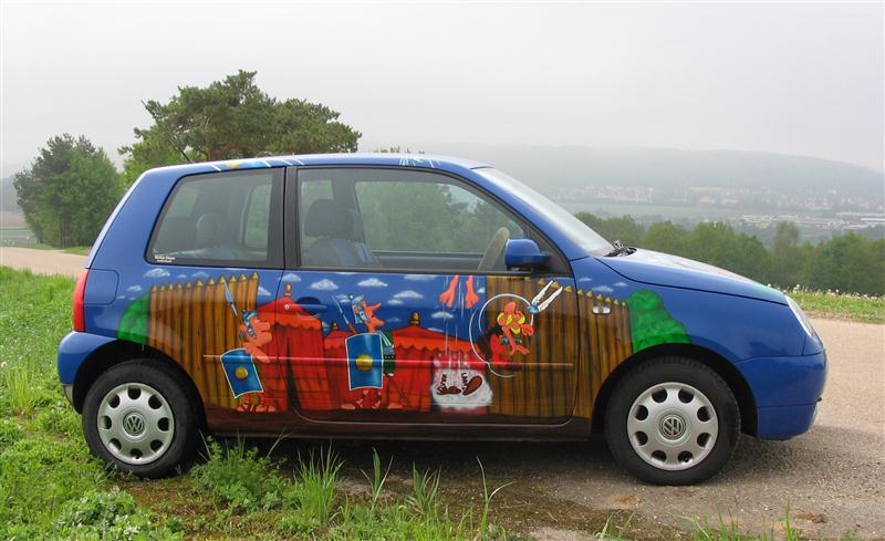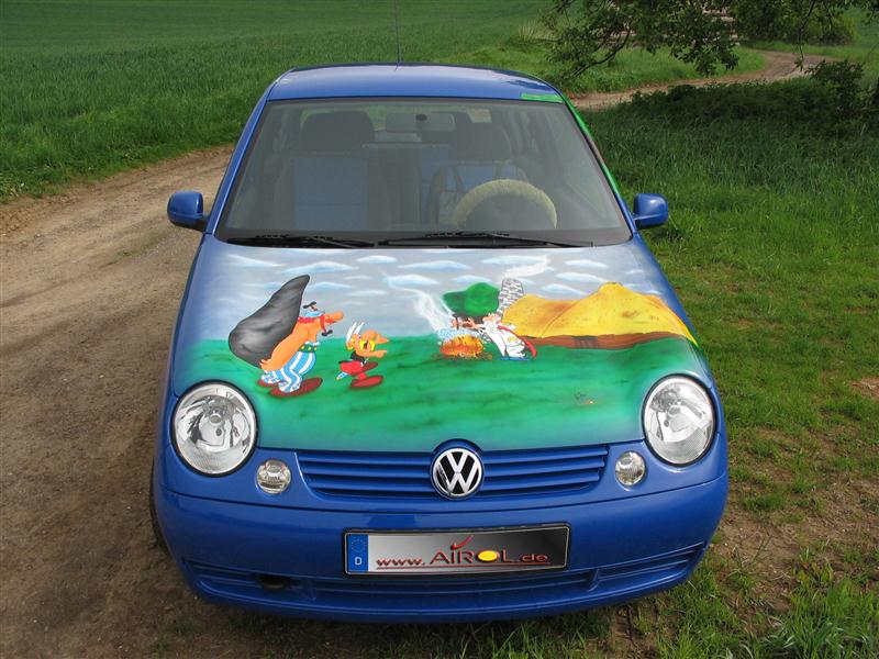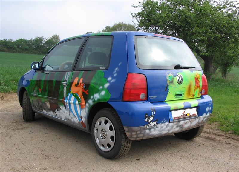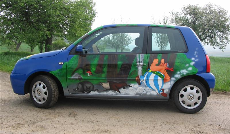 Jagdszenen aus Gallien wurden auf diesem VW-Lupo umgesetzt. Asterix und Obelix bei der Wildschweinjagd, beim fröhlichen Römer verkloppen oder ganz idyllisch zuhause beim Druiden Miraculix. Auf das Heck zauberten wir eine Landkarte mit dem kleinen gallischen Dorf in der Bretagne. Und dann flitzt da noch Idefix durch das Bild bzw. über die Stoßstange.