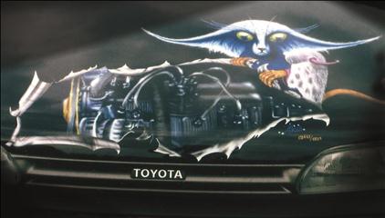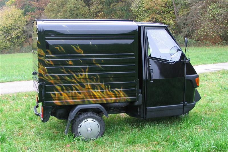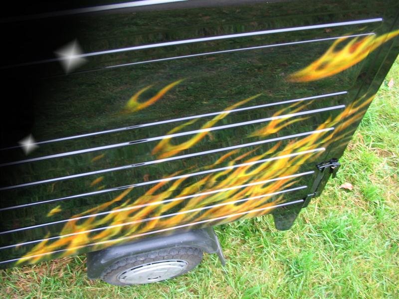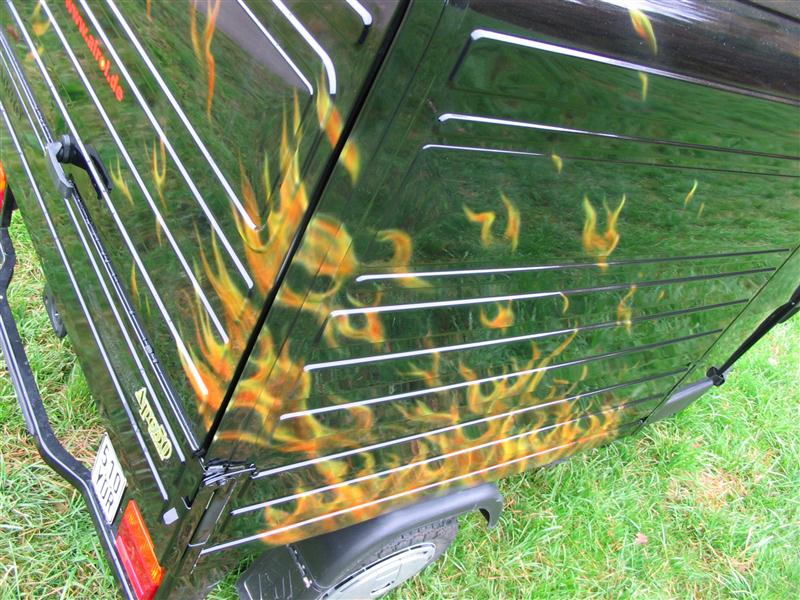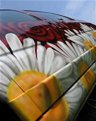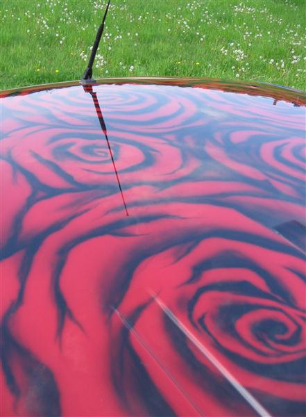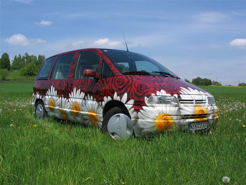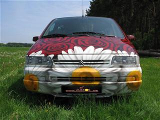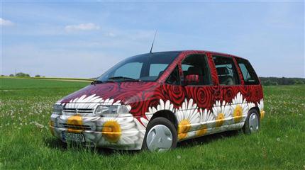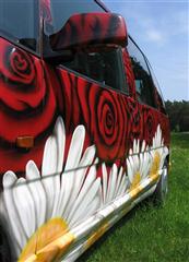 Hier kommt nicht der Fleurophändler, sondern ein bunter Blumenstrauß auf vier Rädern! Rote Rosen und weiße Margeriten zieren diesen Van auf der kompletten Fläche. Dieses Rundum-Airbrush sorgt für freudig-überraschte Blicke auf den Straßen und zaubert so manches Lächeln auf die Gesichter der Passanten